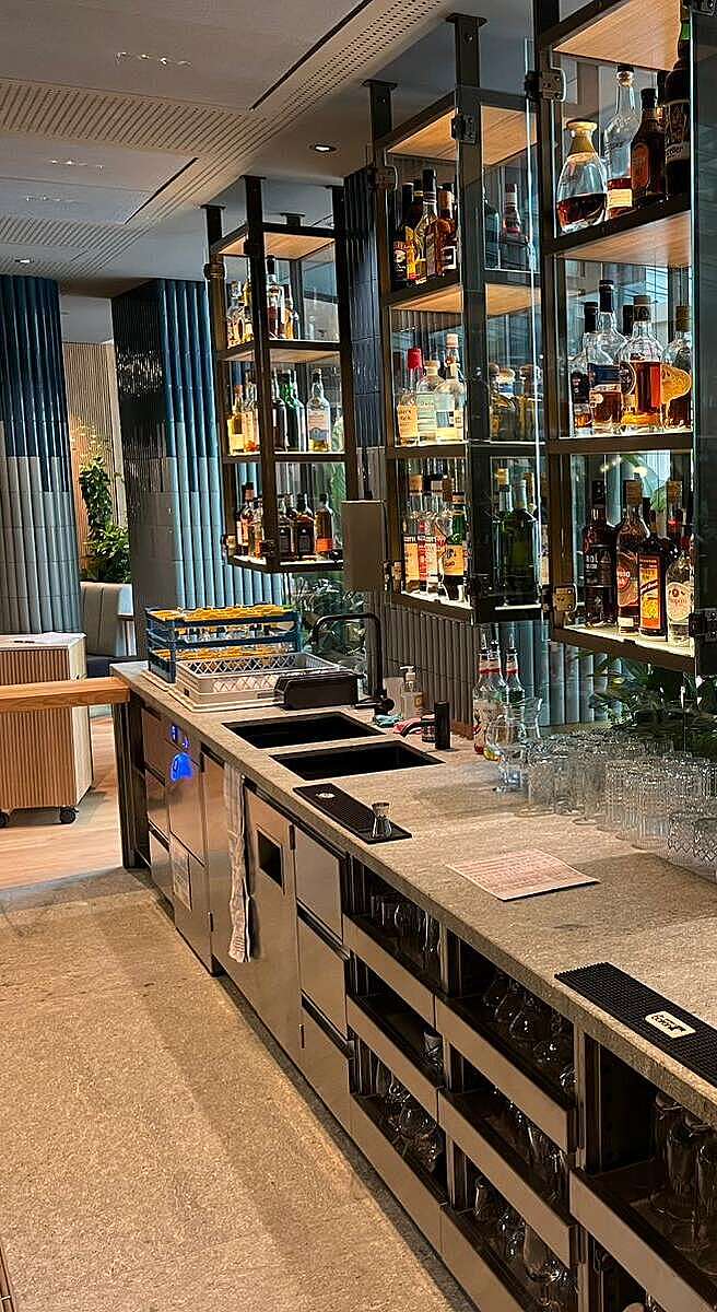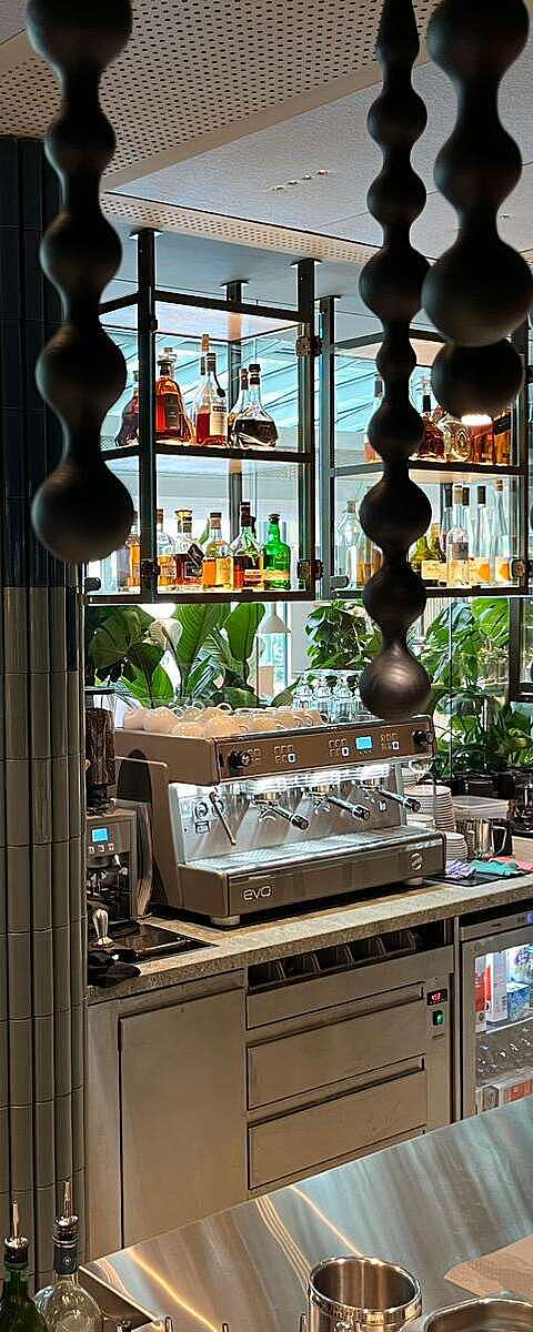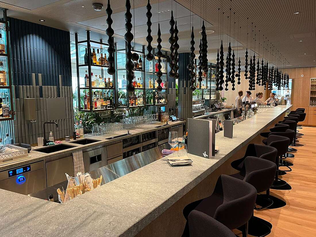 Mitten im Restaurant befindet sich das Herzstück des Restaurants, die monolithische Bar mit einer Theke aus Schweizer Stein. Die umfangreiche Bareinrichtung bietet dem Bartender grenzenlose Möglichkeiten. Nebst Kaffeespezialitäten werden 365 Tage im Jahr erstklassige Apéritifs, Cocktails, After-Dinner-Drinks, erlesene Weine und auch alkoholfreie Getränke angeboten.
