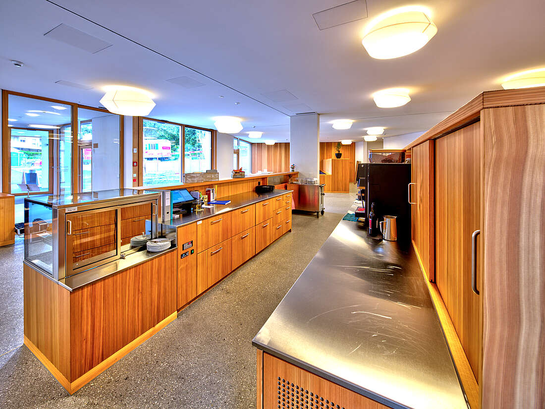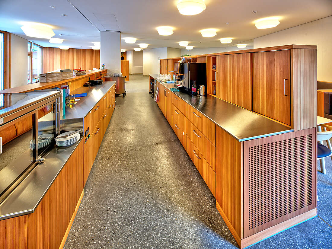 Der Neubau Haus Stelle im Zentrum Rund ums Alter setzt auf modernste Küchentechnologie. Die neue Produktionsküche bereitet täglich ca. 600 Mittagsmahlzeiten frisch in der Cook & Serve Methode zu. Das Restaurant im Neubau verfügt über eine innovative Buffeteinrichtung mit mobiler Speisenausgabe und bietet Platz für Besucher, Mittagsgäste und MieterInnen des betreuten Wohnens. Direkt angrenzend an das öffentlich zugängliche Restaurant befindet sich eine ganztägig geöffnete Cafeteria mit einem neu konzipierten Getränkebuffet mit flexibler Speisenausgabe. Für die Mitarbeitenden steht ein separater Verpflegungsbereich mit zeitgemässer Gastro-Infrastruktur zur Verfügung.