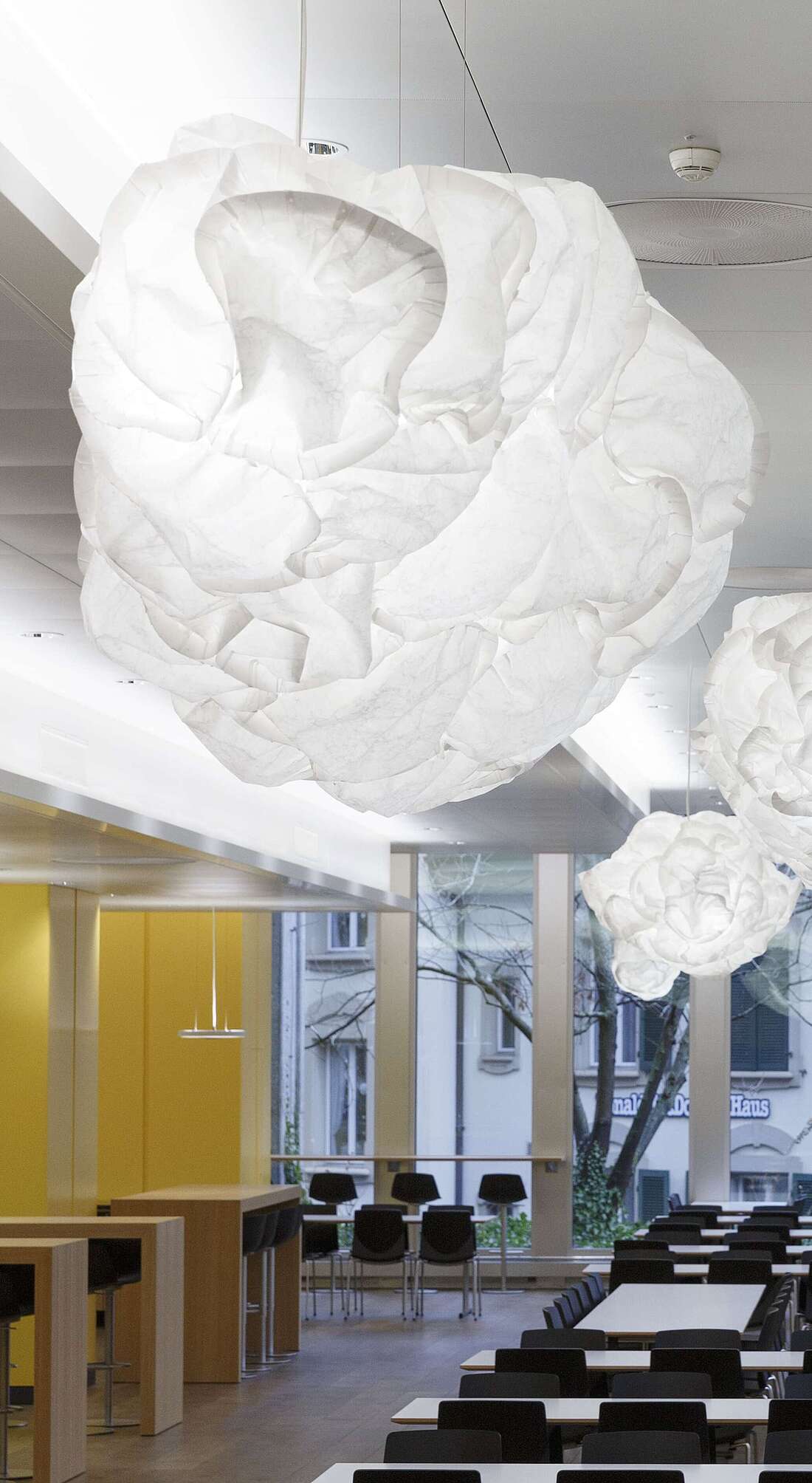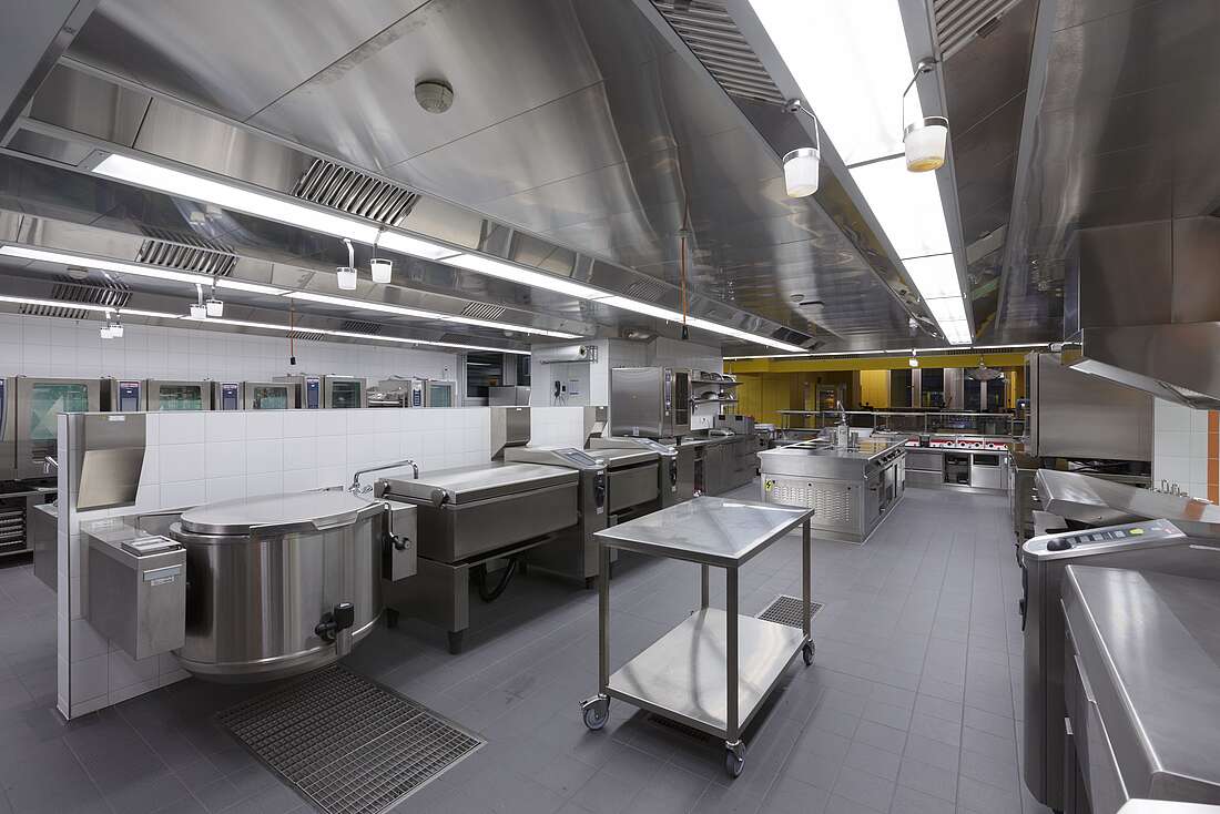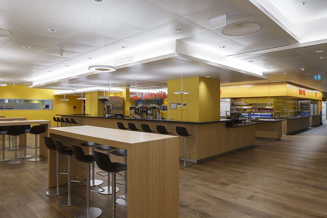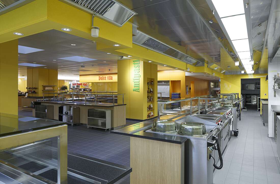 Das Restaurant Sole im Kinderspital der Insel umfasst eine eigene Produktionsküche, eine grosszügige Free Flow-Anlage mit Frontcoocking sowie eine separate Kaffeebar. Täglich werden bis zu 1200 Mahlzeiten für Patienten, Gäste und Mitarbeitende ausgegeben. Die Geschirrwaschanlage wird über ein Tablett-Abräumband bestückt – mit Sichtbezug zum Gastraum. Die Gästeströme werden geschickt über zwei Eingänge geleitet. Einerseits direkt zur Essensausgabe und andererseits über die Kaffee- und Kuchenstation. Die Kaffeebar ist als bediente Bar autonom organisiert, jedoch in Kombination mit den übrigen Kassenstationen.