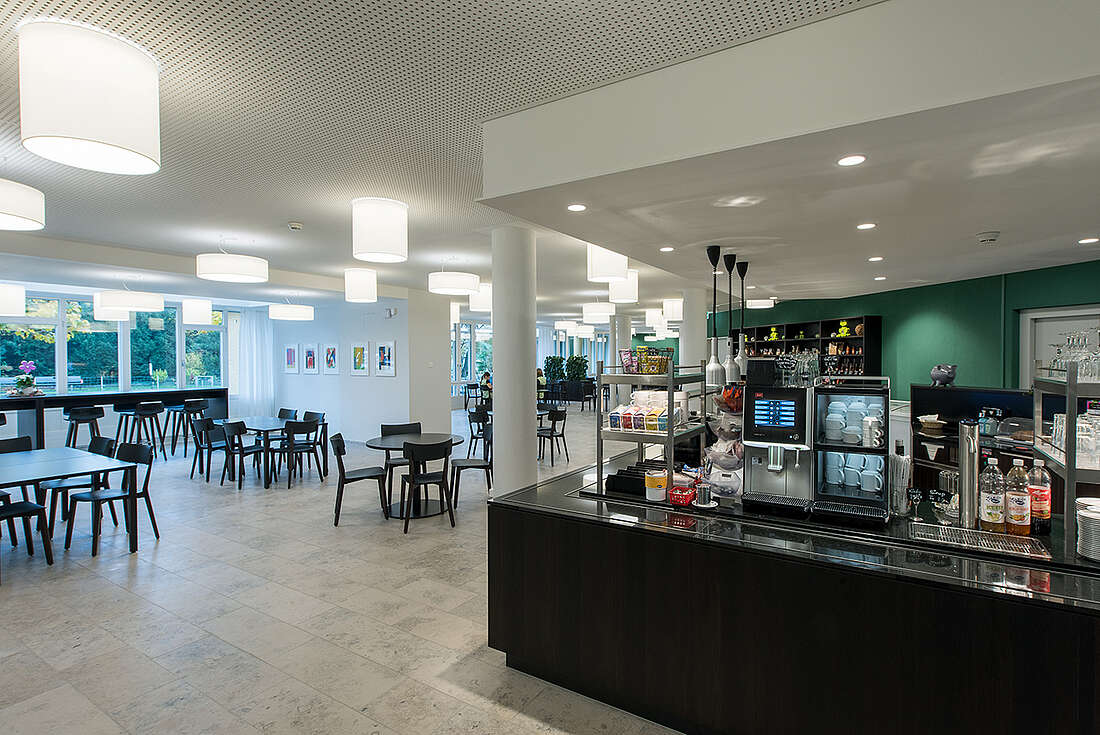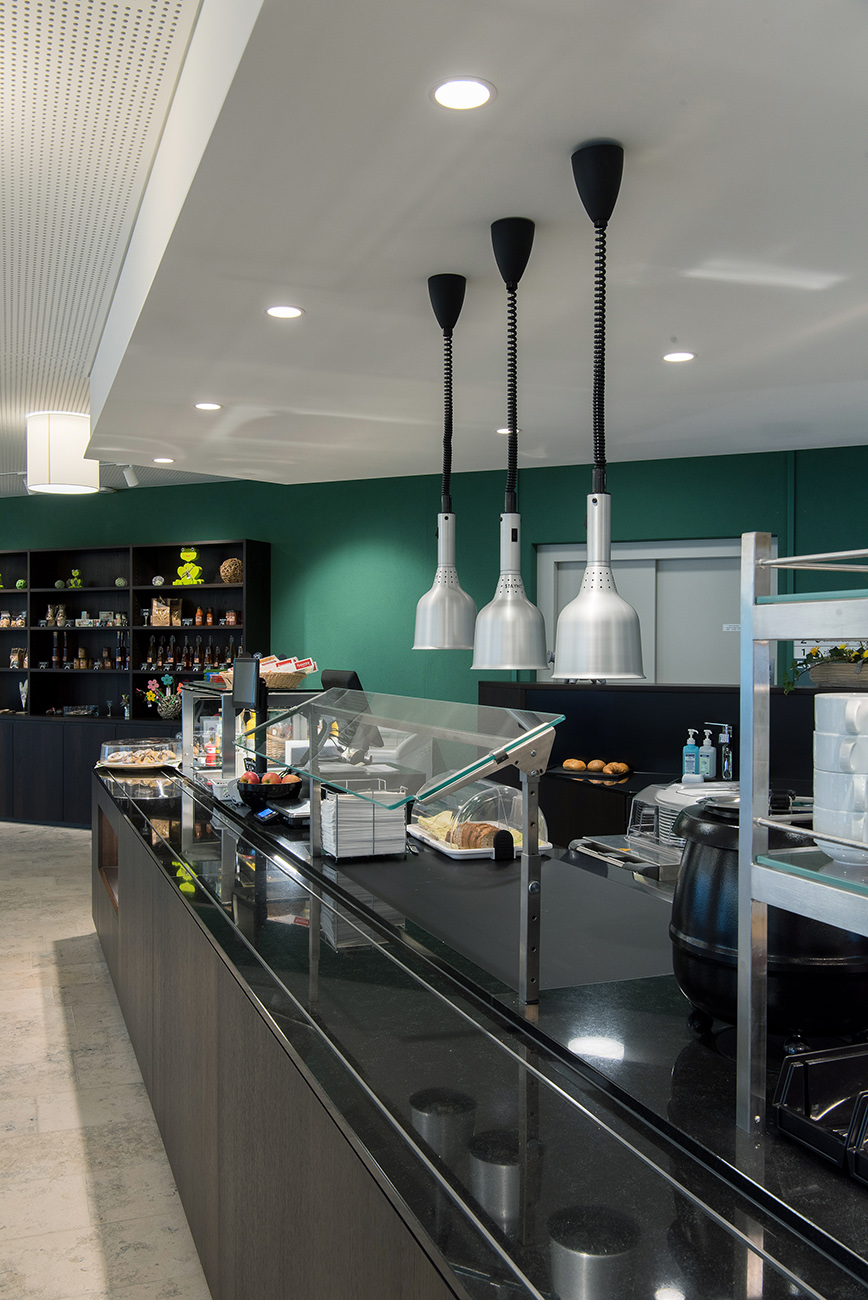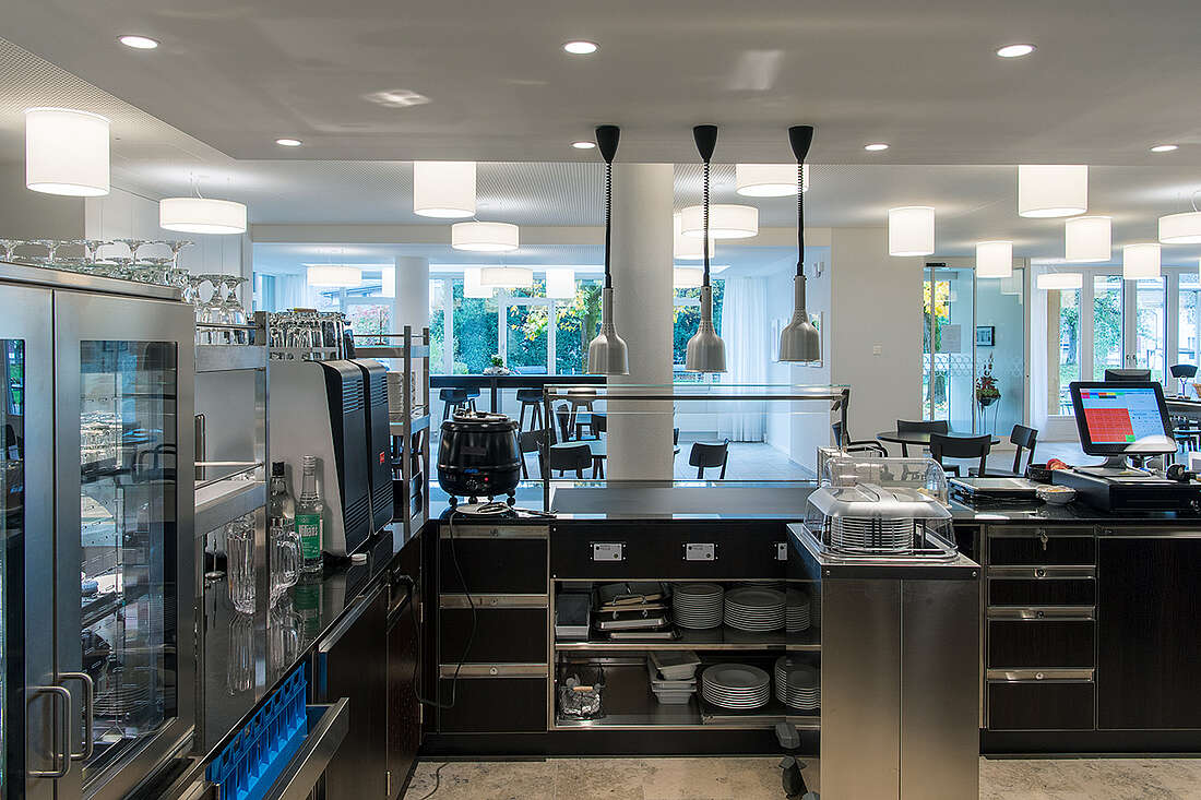 Nebst der Küchensanierung wurde auch die Buffeteinrichtung der Cafeteria sowie die Wohngruppenküchen im Erweiterungsbau geplant. Die Sanierung während laufendem Betrieb erforderte ein Küchen-Provisorium inklusive Lagerräume und Anrichtbereich für den Mahlzeitendienst.