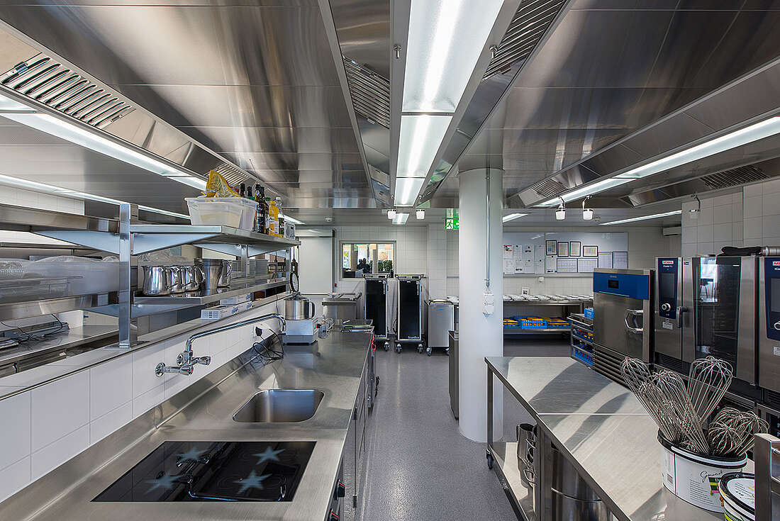 Beim Küchenersatz im Altbau, wurden die Betriebsabläufe und die Produktionskapazität den neuen Anforderungen angepasst. Mittels neuster Küchentechnik können nun täglich bis zu 200 Mahlzeiten im Cook and Chill-Verfahren produziert werden.