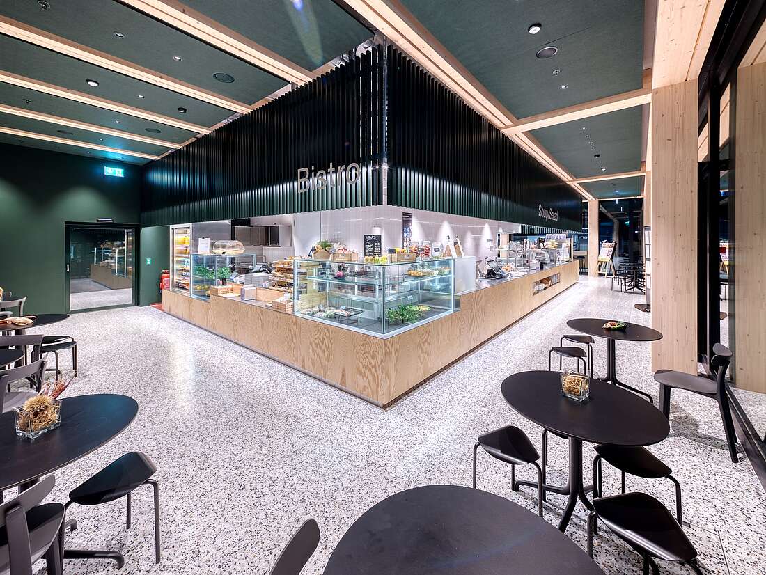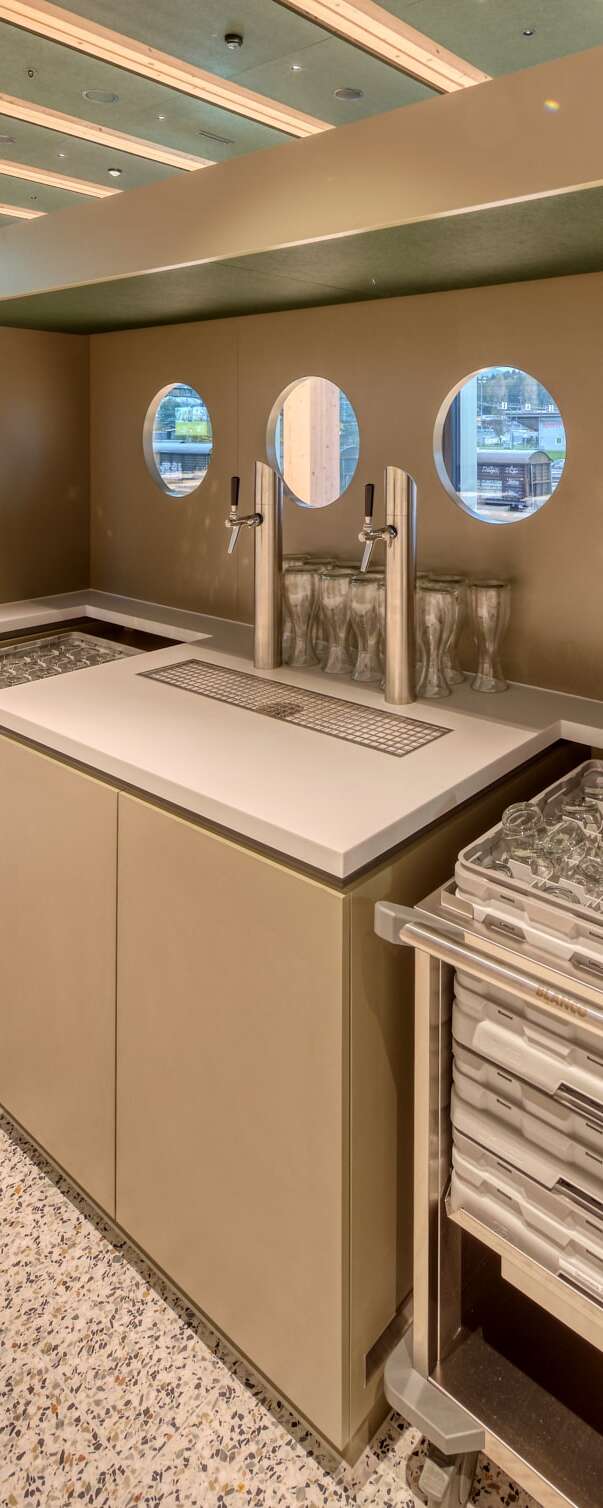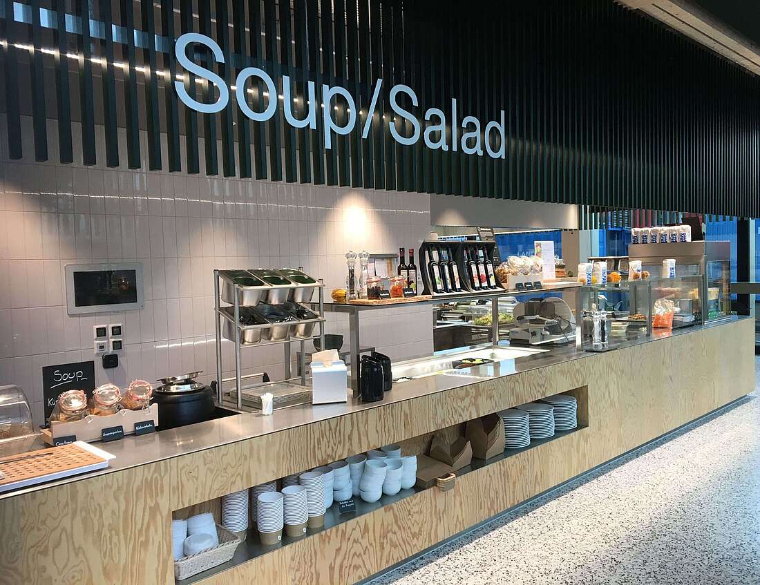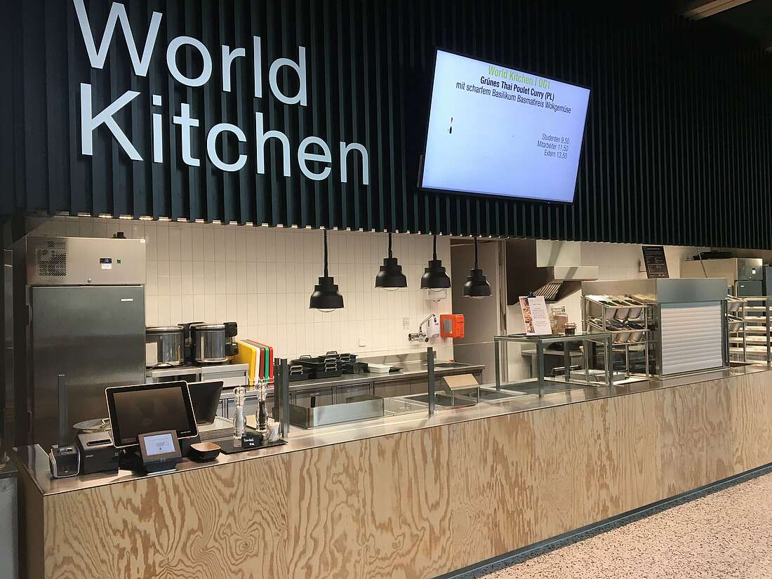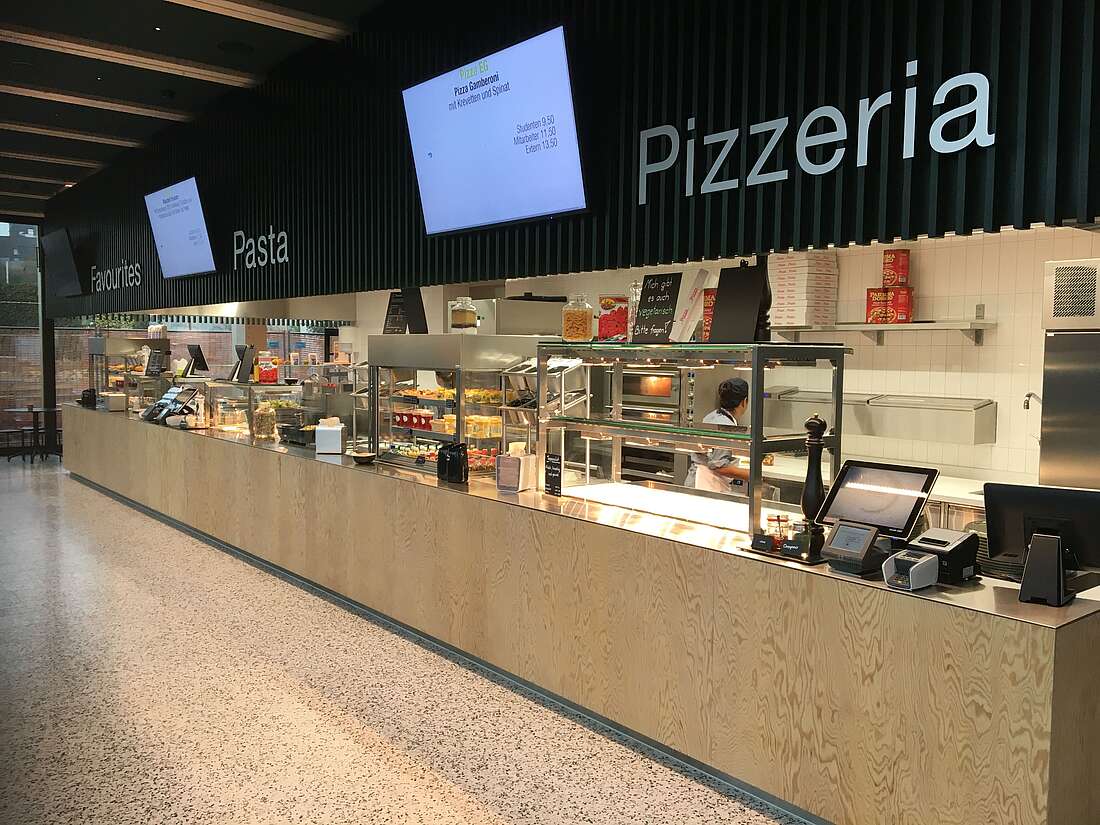Der neue Campus der Hochschule Luzern steht auf dem Suurstoffi-Areal in Rotkreuz, mit dem in der Schweiz einzigartigen Energiekonzept (CO2-neutral). Auf Grund der Raumgeometrie und der geringen Raumbreiten des Neubaus konnte keine zusammenhängende Gastronomie oder eine Free Flow-Anlage im klassischen Stil realisiert werden. Das Konzept sieht daher im Untergeschoss eine Produktionsküche inklusive Lager- und Nebenräume sowie verschiedene Foodislands im Erdgeschoss und 1. Obergeschoss vor. Das themenorientierte Angebot der einzelnen Foodislands ist attraktiv und bei den Stundierenden und Mitarbeitenden sehr beliebt. Für den Betrieb stellt die dreigeschossige Gastronomie jedoch eine besondere Herauforderung dar. Die zentrale Geschirrwaschanlage befindet sich im 1. Obergeschoss, wo das grösste Geschirraufkommen zu erwarten ist.
