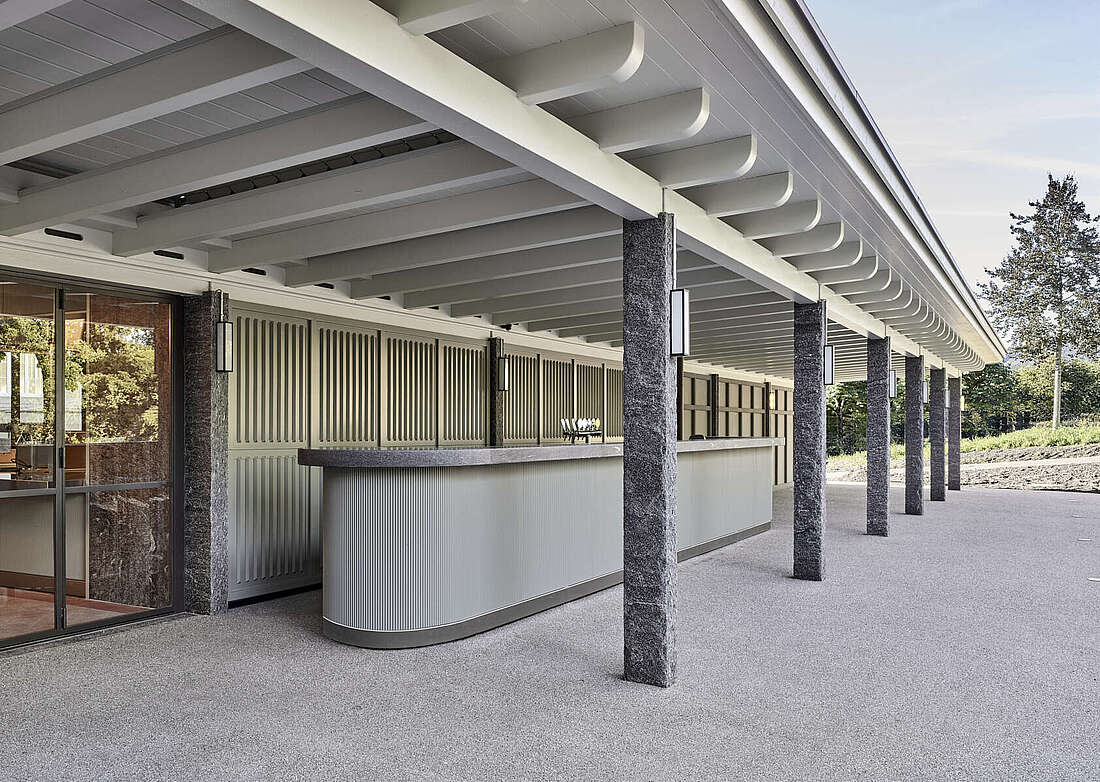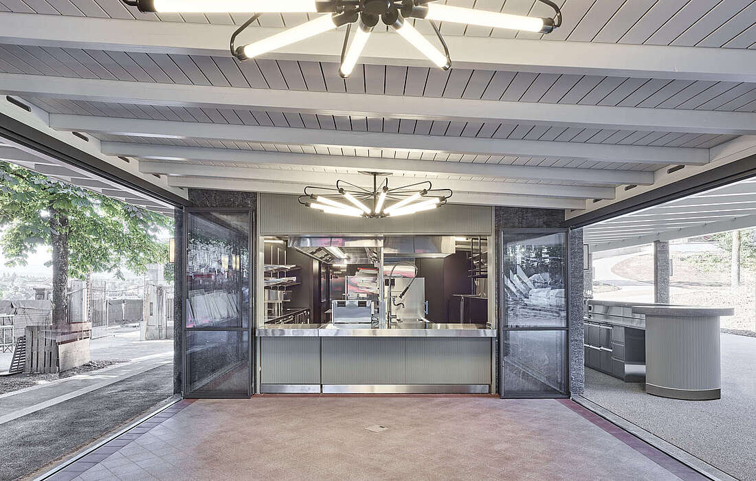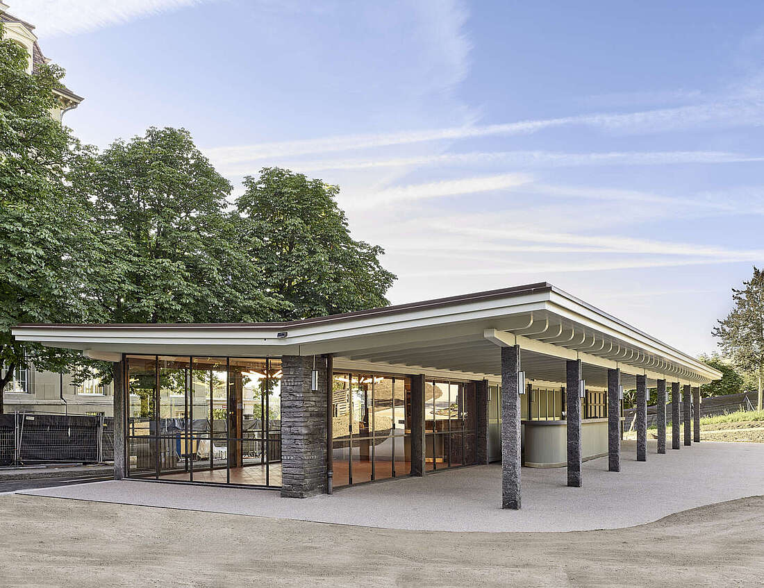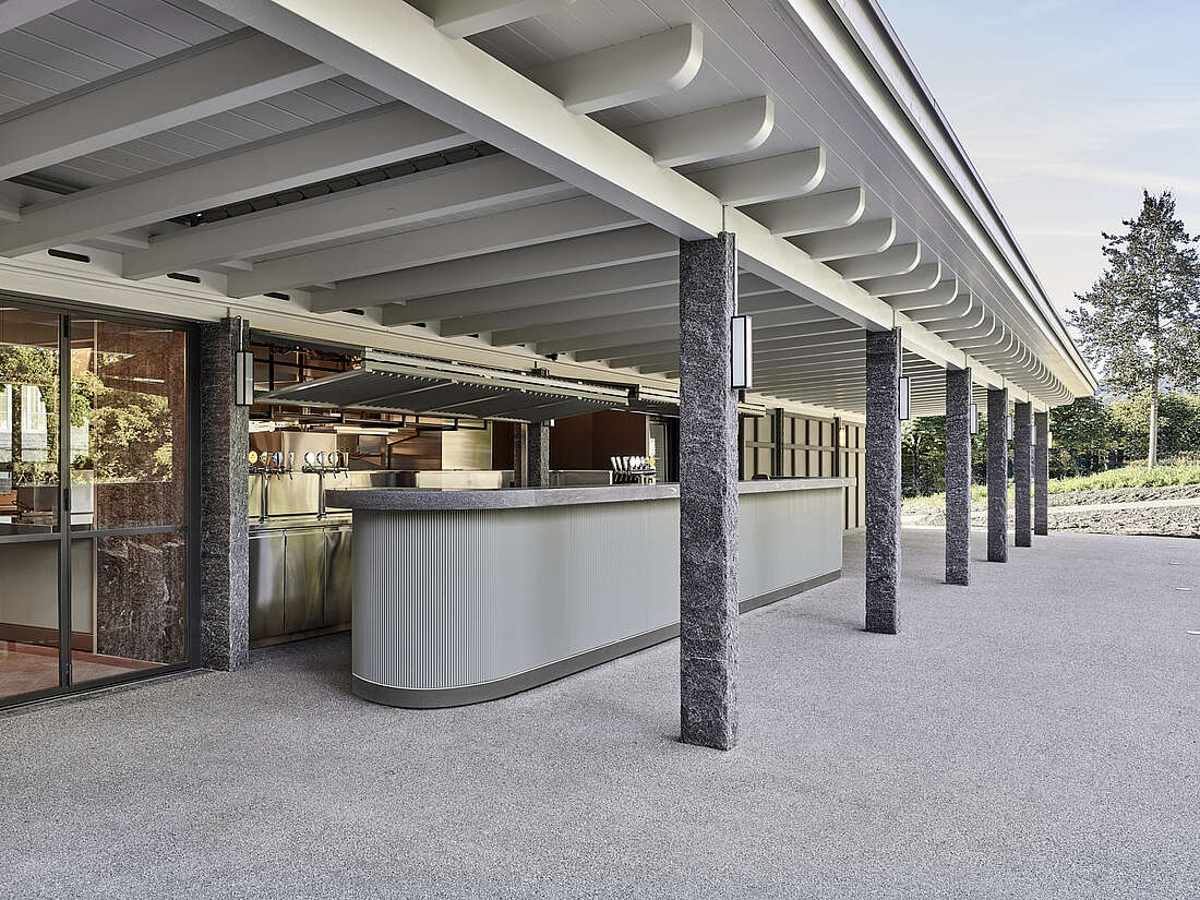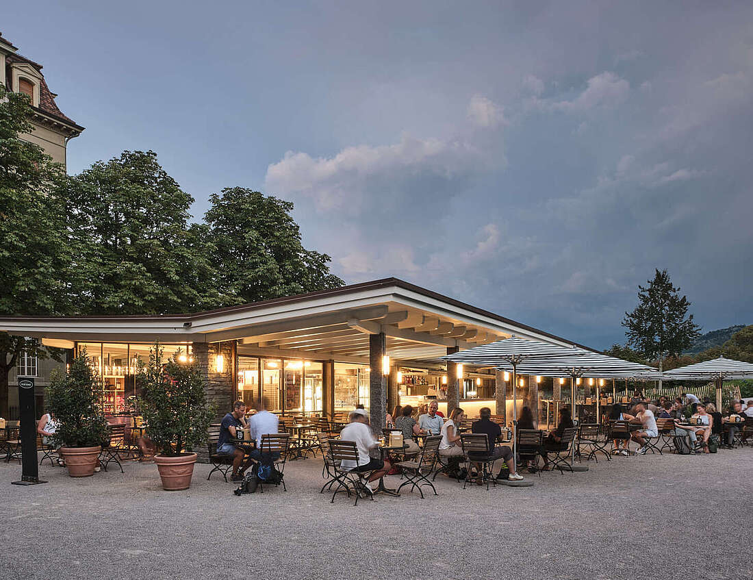 Nach einer umfassenden Renovation wurde die ehemalige «offene Trinkhalle» komplett neu gestaltet. Eine kompakte, moderne Küche und eine grosszügige Aussenbar mit rund 180 einladenden Sitzplätzen schaffen ein einzigartiges Ambiente, das zum Verweilen einlädt.