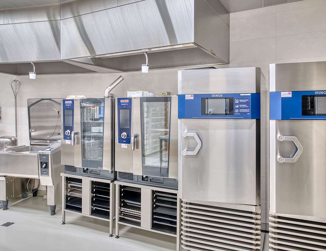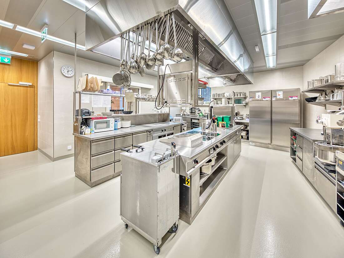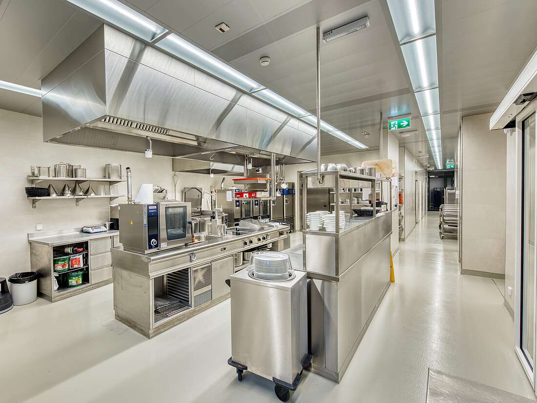 Die zentrale Produktionsküche, inklusive der dazugehörigen Lagerräume, befinden sich ideal im Erdgeschoss. Sämtliche Mahlzeiten für die Bewohnenden und Mitarbeitenden werden im Cook and Chill-Verfahren zeitunabhängig hergestellt und zur Essenszeit regeneriert.