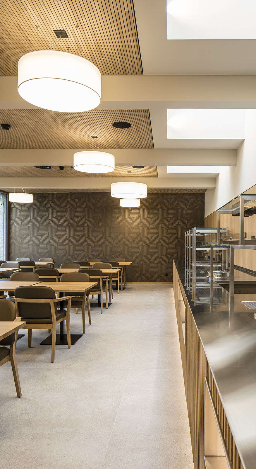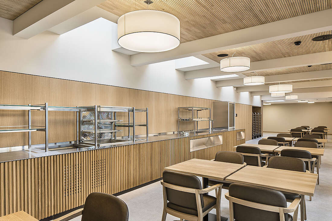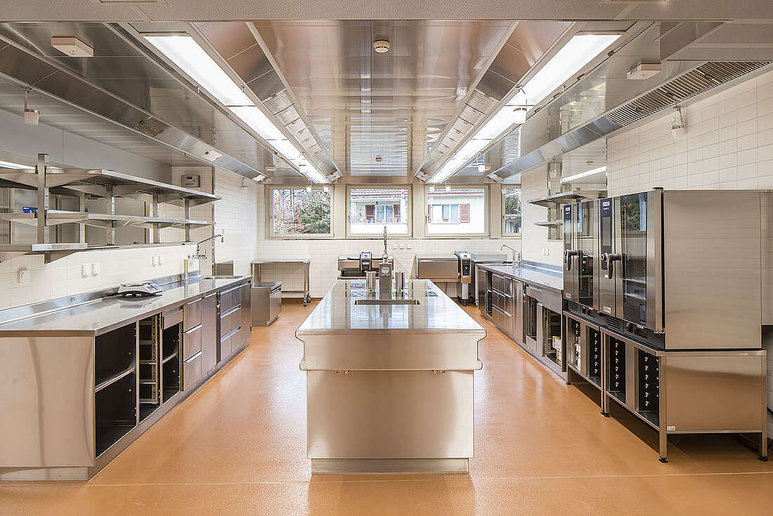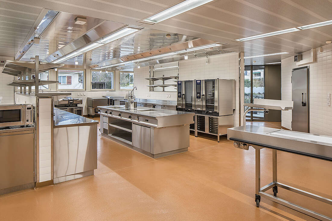 Die Küchen- und Lagerflächen wurden optimiert und die Kücheneinrichtung nach neustem Stand der Technik konzipiert. In der lichtdurchfluteten Küche werden täglich bis zu 160 Mittagsmahlzeiten aus frischen und regionalen Lebensmittel zubereitet. Im hell und warm gestalteten WIA-Café steht für die Zwischenverpflegung ein attraktives Selbstwahlbuffet mit Getränken, Desserts, kleinere Snacks sowie mittags für das Personal ein warmes Tagesmenu zur Verfügung.