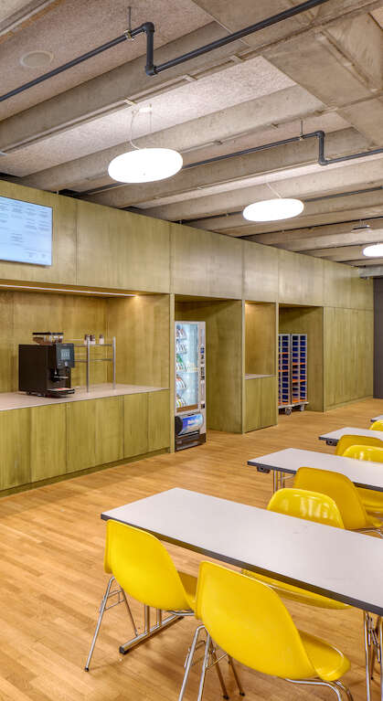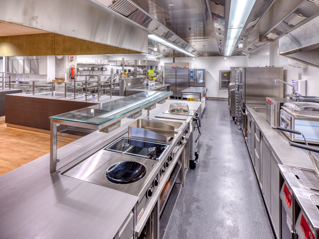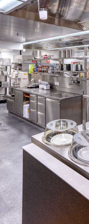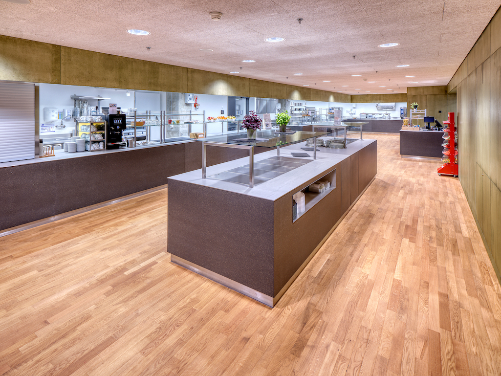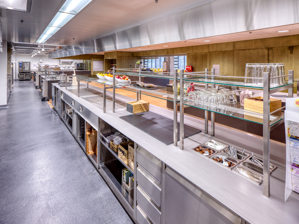 Unter erhöhter Sicherheitsvorkehrungen erfolgte die Sanierung während sechseinhalb Jahren unter laufendem Betrieb. Im Rahmen der Gesamtsanierung wurde die bestehende Schulmensa durch eine neue Produktionsküche einschliesslich Selbstbedienungsanlage ersetzt. Die Reorganisation der Küche sowie der dazugehörigen Lager- und Nebenräume ermöglichte eine Anpassung des Raumbedarfs an zukünftige Bedürfnisse. Durch den Einsatz modernster Küchentechnik können nun täglich bis zu 300 Mittagsmahlzeiten produziert und ausgegeben werden. Während laufendem Bau- und Schulbetrieb, wurden die Hauswirtschaftsküche temporär in eine Regenerationsküche umgewandelt sowie ein Verpflegungsbereich mit mobilen Ausgabestellen als Provisorium ausgestattet.